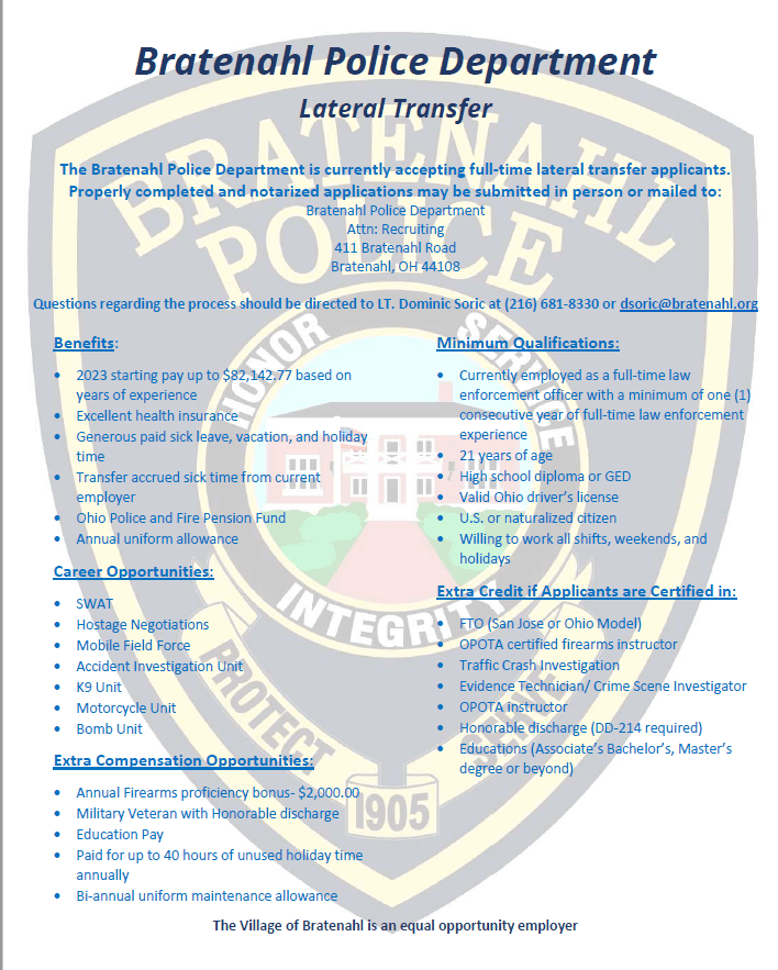 The Bratenahl Police Department is currently accepting full-time lateral transfer applicants. Please click on the attached flyer for more information. If you would like to apply, please download and complete the application listed below.